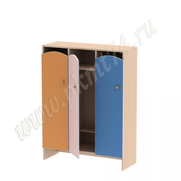 Шкаф для детской одежды «Волна 3 без короба» – функциональная вместительная мебель с распашными дверцами, фасады которых выполнены в популярном классическом стиле «Волна». Их используют для оборудования детских садов и других образовательных учреждений удобной мебелью.