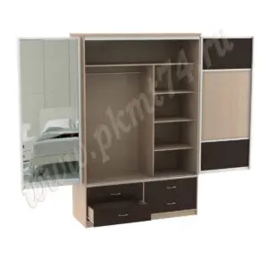 Нижняя часть шкафа оборудована выдвижными ящиками, которые идеально подходят для хранения белья, носков и другой мелкой одежды. Благодаря удобной конструкции, открытие ящиков не требует раздвигания створок шкафа, что делает использование шкафа максимально удобным и практичным.