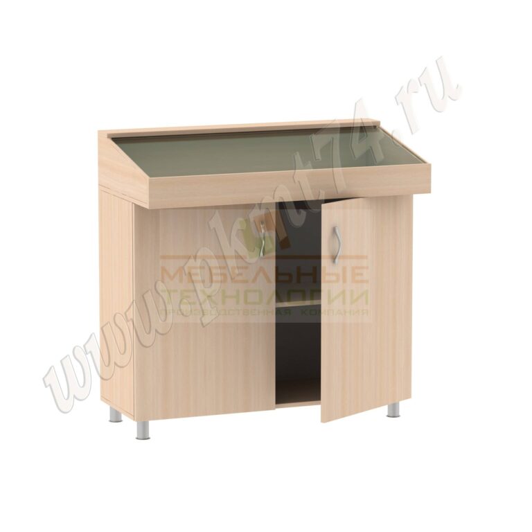 Нижняя часть витрины для школьного музея оформлена в виде вместительной тумбы с полкой, куда можно сложить неактуальные артефакты школьной жизни, местной истории, сохраняя их в целости до намеченного мероприятия.